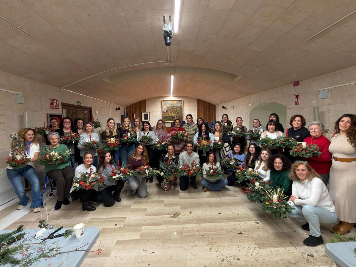 La actividad, desarrollada en la Sala de Plenos, contó con la participación de alrededor de 80 personas, que aprendieron a confeccionar centros de mesa navideños utilizando elementos naturales tradicionales como la murta, el pino y el lentisco, a los que se sumaron piñas, diferentes lazos y otros utensilios decorativos que enriquecieron las composiciones.