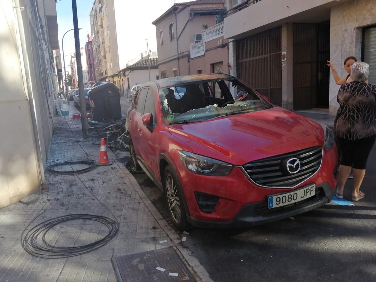Un incendio de contenedores destruye tres coches y una moto junto a la calle Manacor de Palma