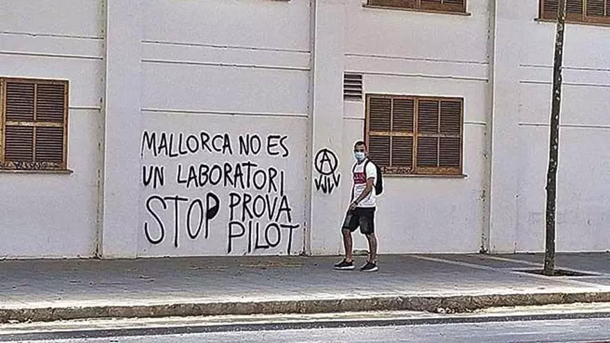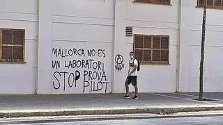 Pintada en el parque de ses Estacions contra que la isla sea un "laboratorio" para testar las nuevas vacaciones. / M. Mielniezuk