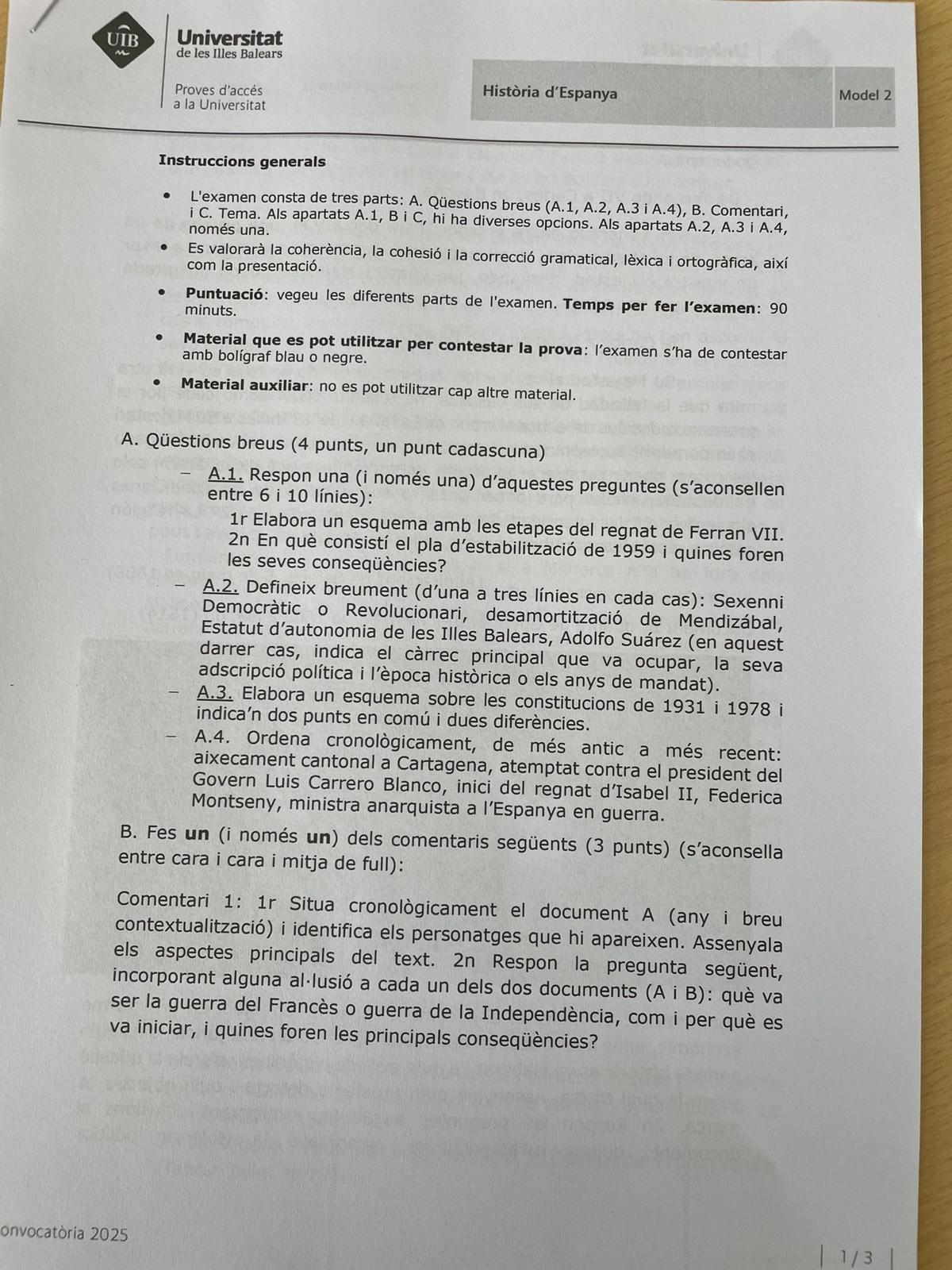 Vea aquí el examen completo de Historia de España de la PAU 2025 de Baleares