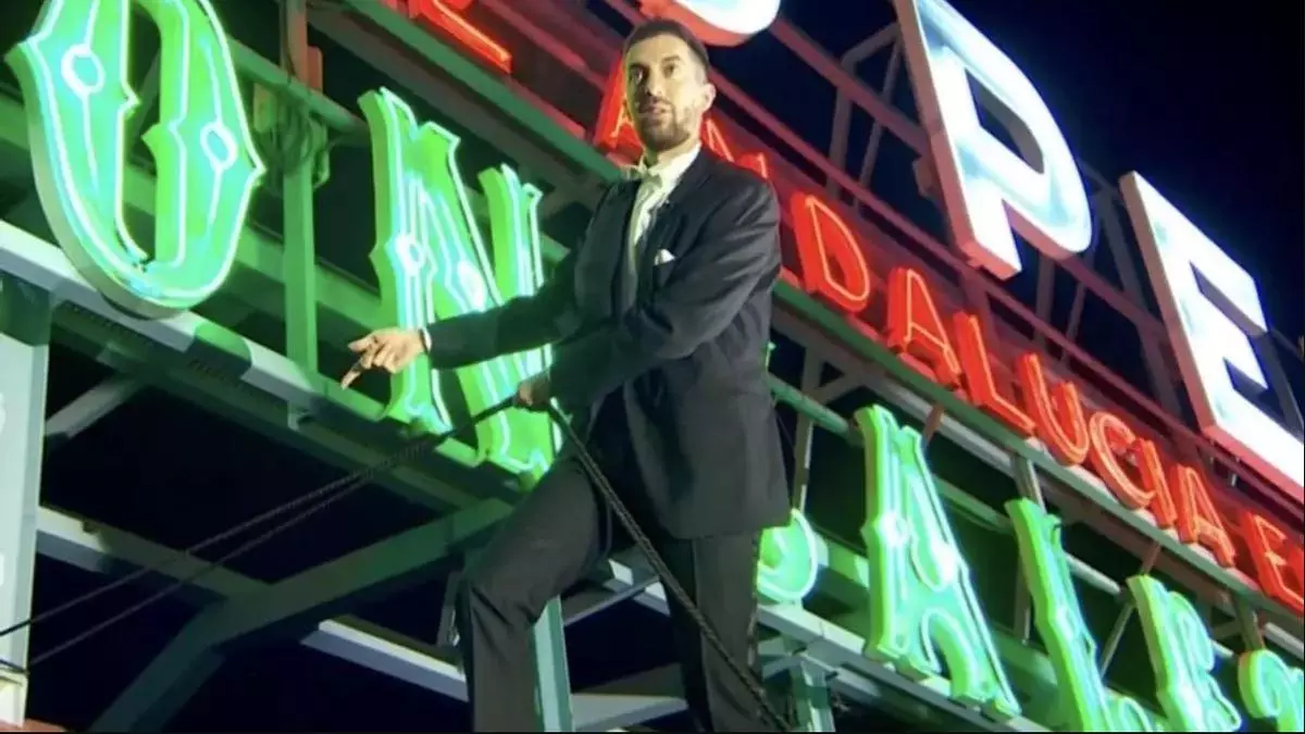 David Broncano, arrancando las Campanadas colgado del mítico letrero de la Puerta del Sol.
