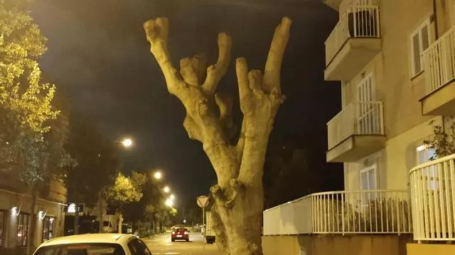 La Associació de Veïns i Veïnes Sa Llotja-Es Born denuncia la poda de un ejemplar en la calle Illa de Corfú en Ciudad Jardín. La plataforma ha alertado del cambio este lunes por la mañana en el que muestra cómo no ha quedado ninguna rama ni ninguna hoja del emblemático árbol.