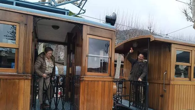 Los primeros pasajeros del Tren de Sóller tras reanudar su servicio. / Joan Mora